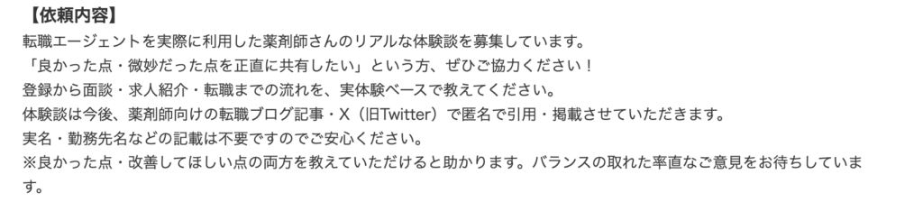 ※本記事の体験談は、クラウドワークスで実際に薬剤師さんへ依頼・収集した内容をもとにした個人の体験談・感想です。内容は個人の経験であり、すべての方に当てはまるものではありません。