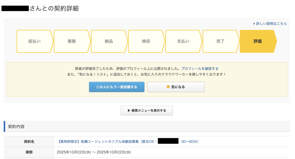 ※本記事の体験談は、クラウドワークス上で実際に薬剤師さんへ依頼・収集した内容をもとに構成しています。下記は実際の募集・契約時のスクリーンショットです(個人情報は伏せています)。