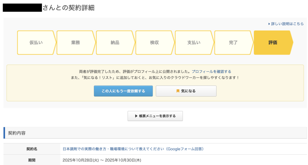 ※本記事の体験談は、クラウドワークス上で実際に薬剤師さんへ依頼・収集した内容をもとに構成しています。下記は実際の募集・契約時のスクリーンショットです(個人情報は伏せています)。