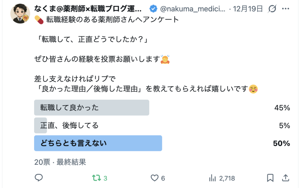 Xで20名に「転職してどうだったか?」とアンケートを取った結果がこちら。