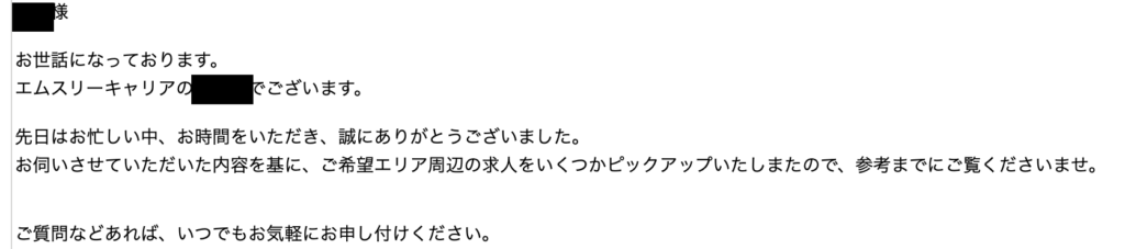 ヒアリングが一通り終わり、5日後に再度日時設定。次の面談の前に以下のような求人紹介メールと求人情報が届きました。