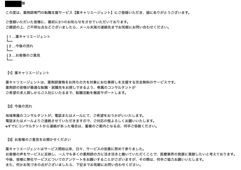 | エージェントの質は? | 私が当たった担当者はとても頼りになりヒアリング力も高かった。体験談では合わない人もいたが大半の薬剤師からは好印象。 |